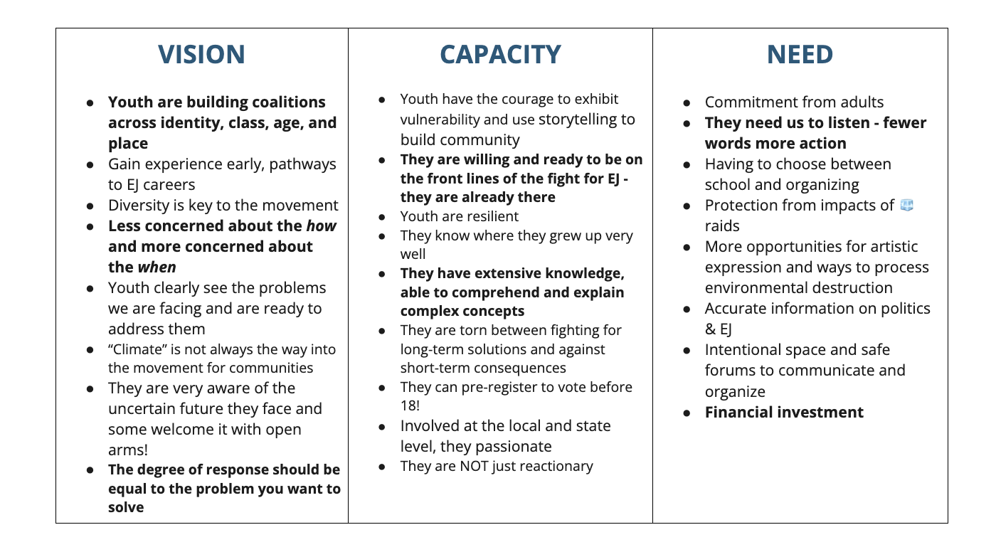 To close our discussion, this new coalition of Champions for Youth identified what is needed to successfully support youth EJ organizers: